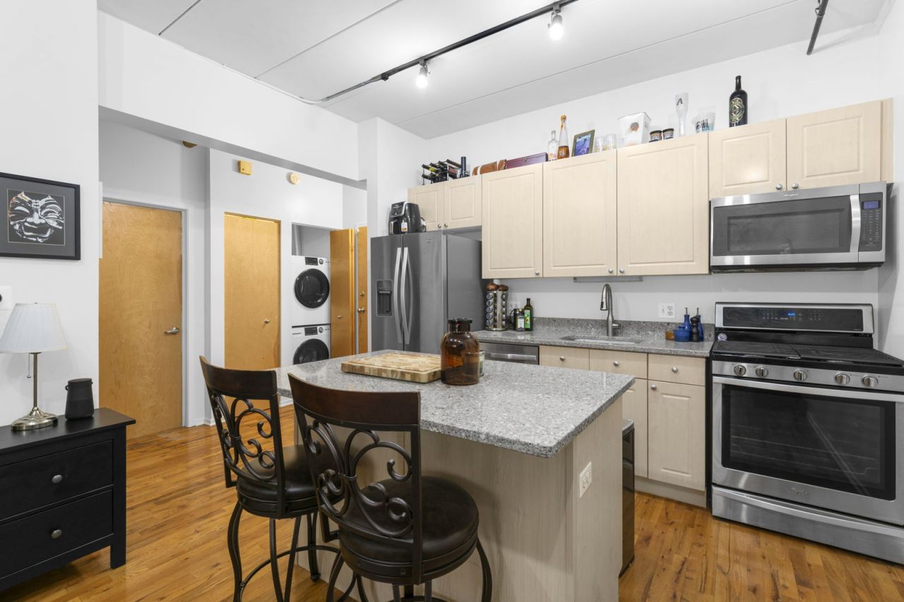 Welcome to this inviting junior one-bedroom condo in the heart of Michigan Avenue. This loft-style unit features an open floor plan with a functional layout ideal for everyday living and entertaining. The kitchen is equipped with quartz countertops, stainless steel appliances, and a convenient island. The unit offers hardwood floors throughout, fresh paint, and newly replaced shutters. Recent updates include a new HVAC system (2023) and an in-unit washer and dryer (2025). The spacious bathroom features a soaking tub, while the shared balcony overlooks a landscaped courtyard, providing a pleasant outdoor retreat.Additional storage and one garage parking space come with the unit. This elevator building also features a shared roof deck.Located in the desirable South Loop, you're just moments from public transportation, the lakefront, parks, museums, shopping, and dining, including Go Grocer, Trader Joe's, Jewel-Osco, and more, as well as easy access to Soldier Field and Lake Shore Drive.